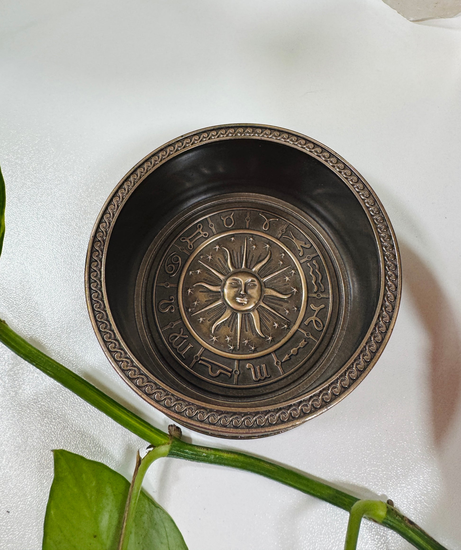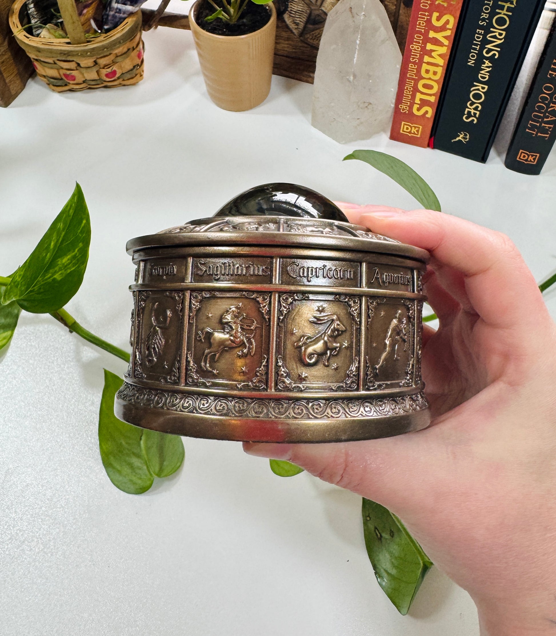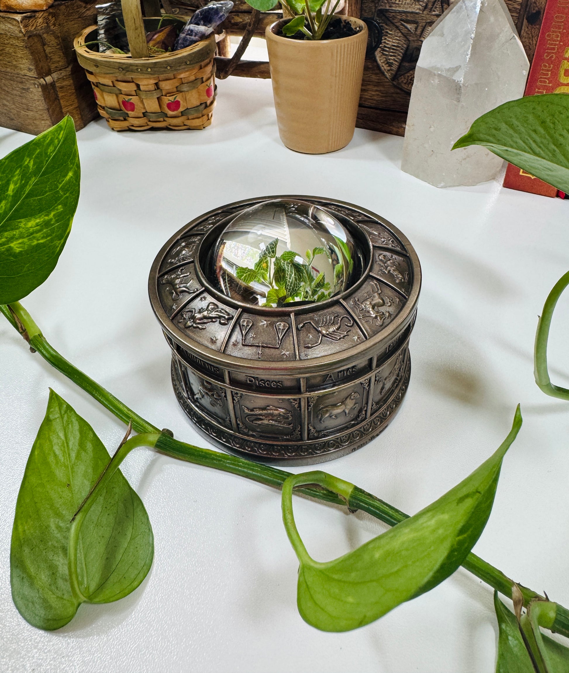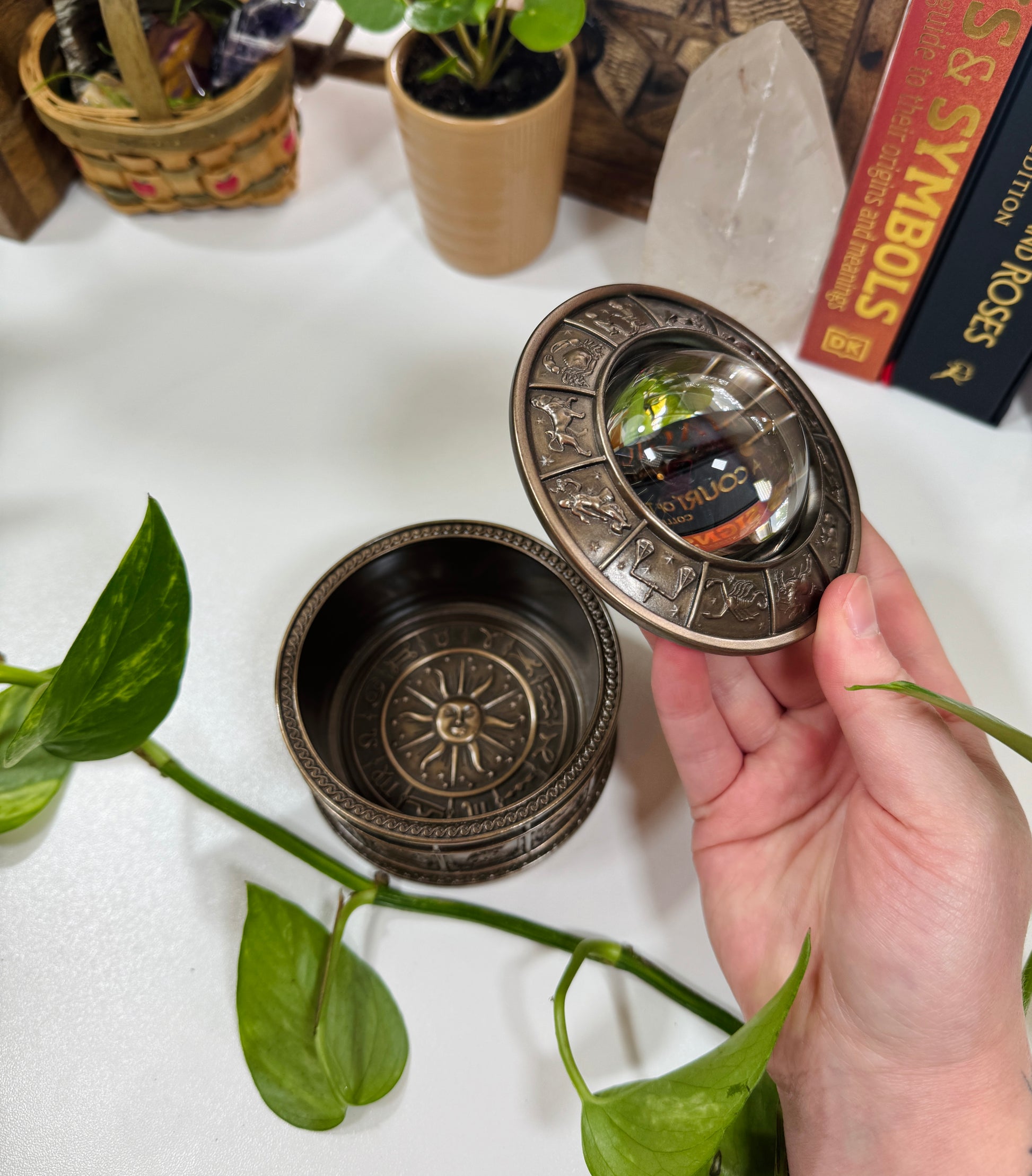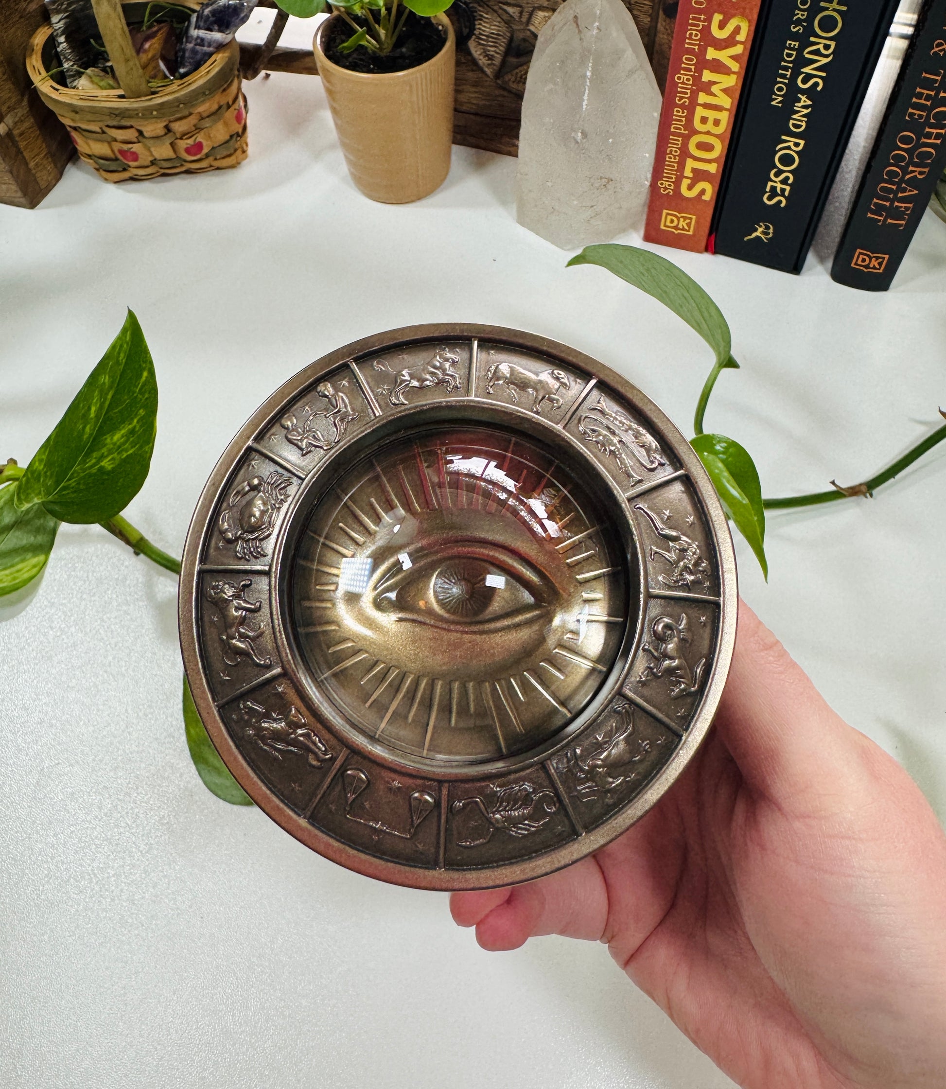 A beautifully detailed trinket box featuring the 12 zodiac signs wrapped around the sides and an all-seeing eye design on the lid. The domed top magnifies the eye, giving it a mystical presence as though watching over your space. Inside, the base is etched with a radiant sun design, tying the symbolism of vision, astrology, and cosmic cycles together.