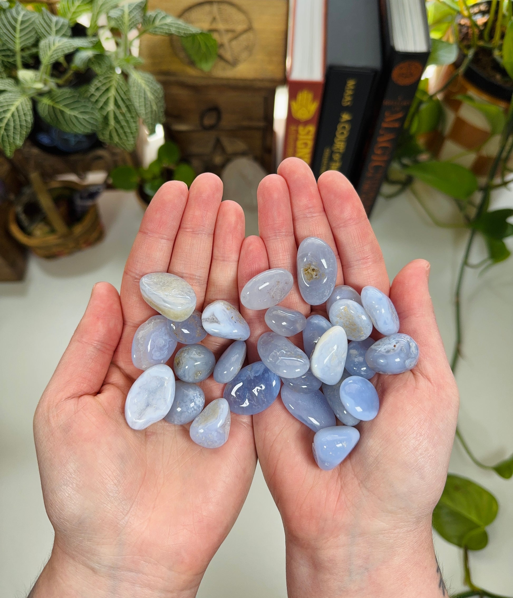 A stone of peace and gentle communication, Blue Lace Agate carries soft blue and white bands that feel like waves of calm energy.
