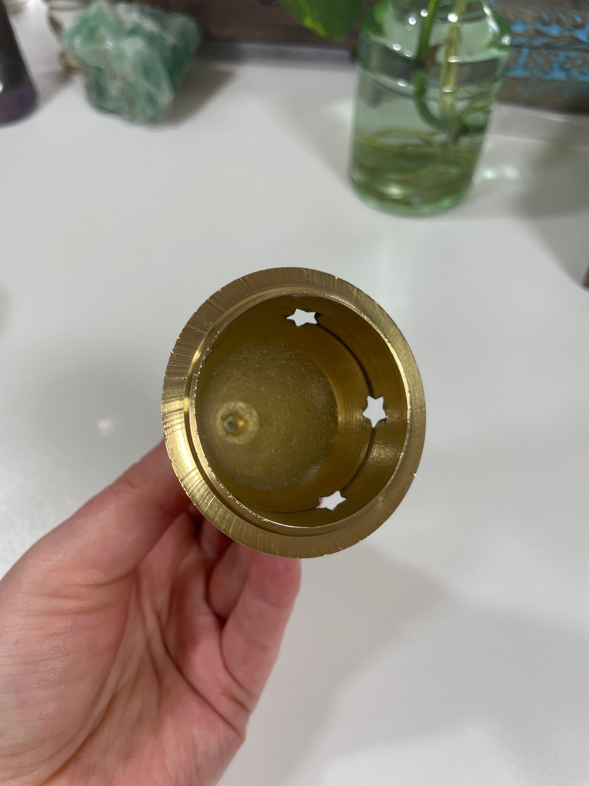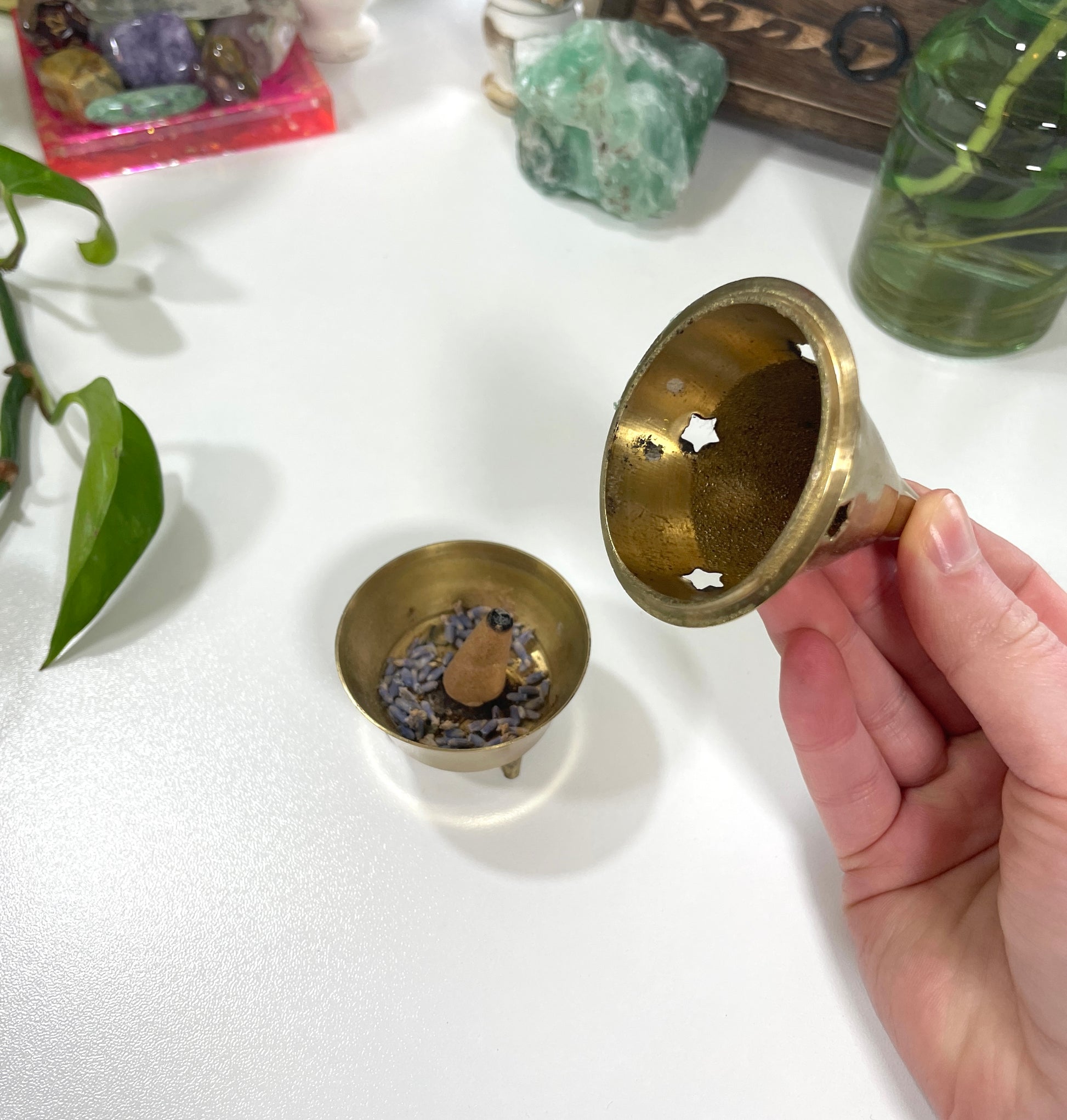Crafted from solid brass, this mini burner is designed to hold cone incense with ease. Its timeless shape and golden finish make it a beautiful addition to any altar, ritual kit, or travel pouch. Use it to cleanse energy, scent your space, or anchor your daily spiritual practice.