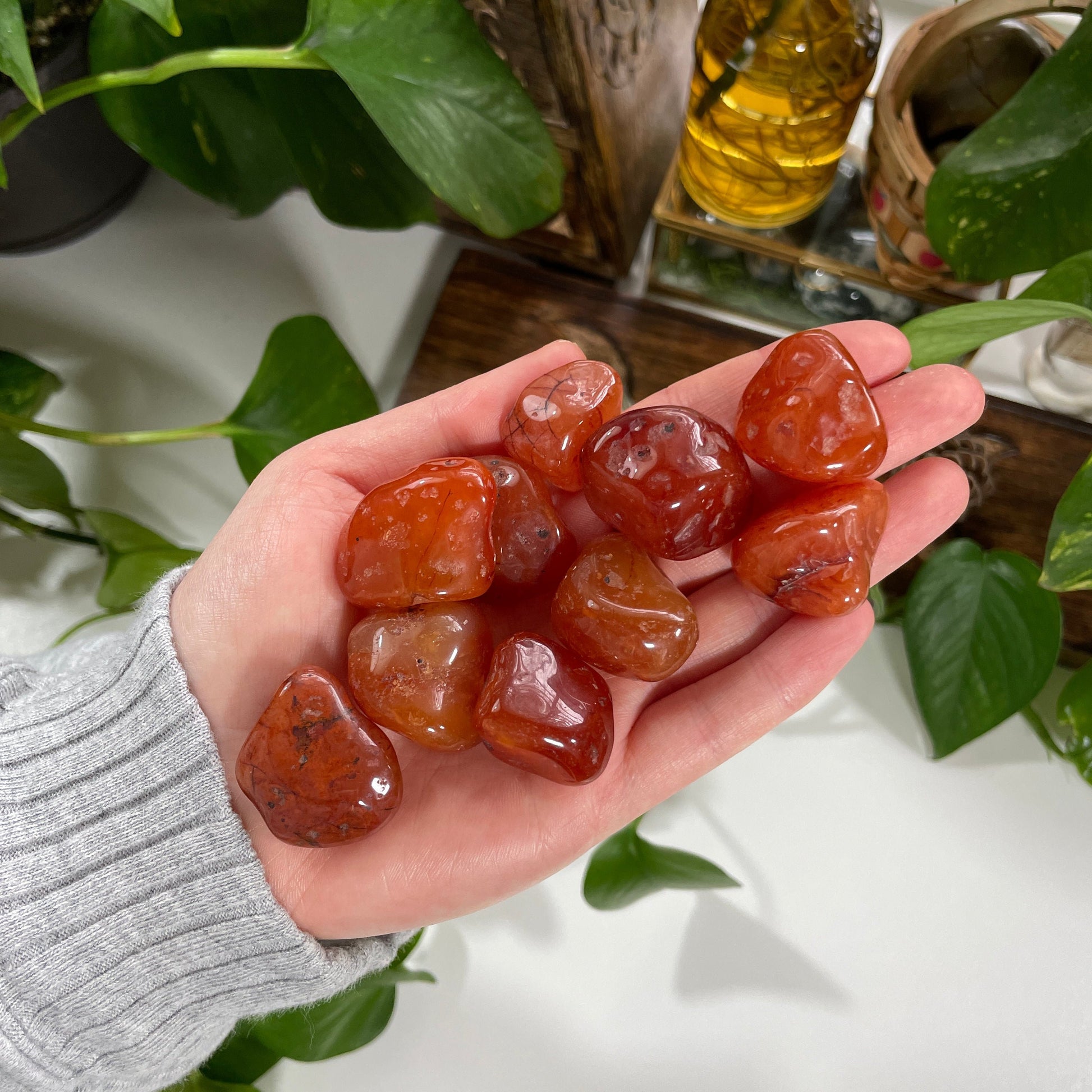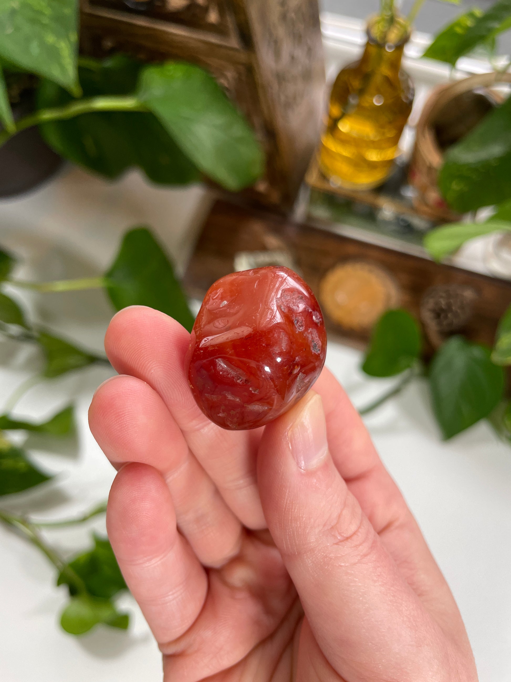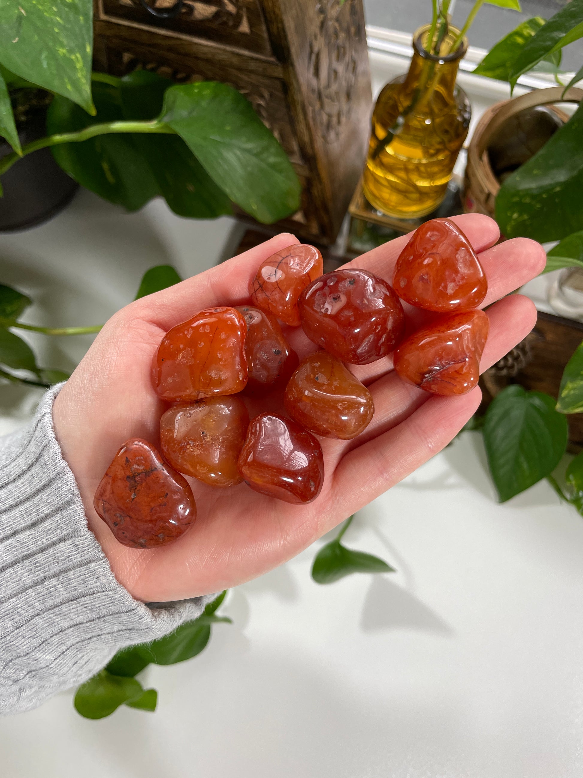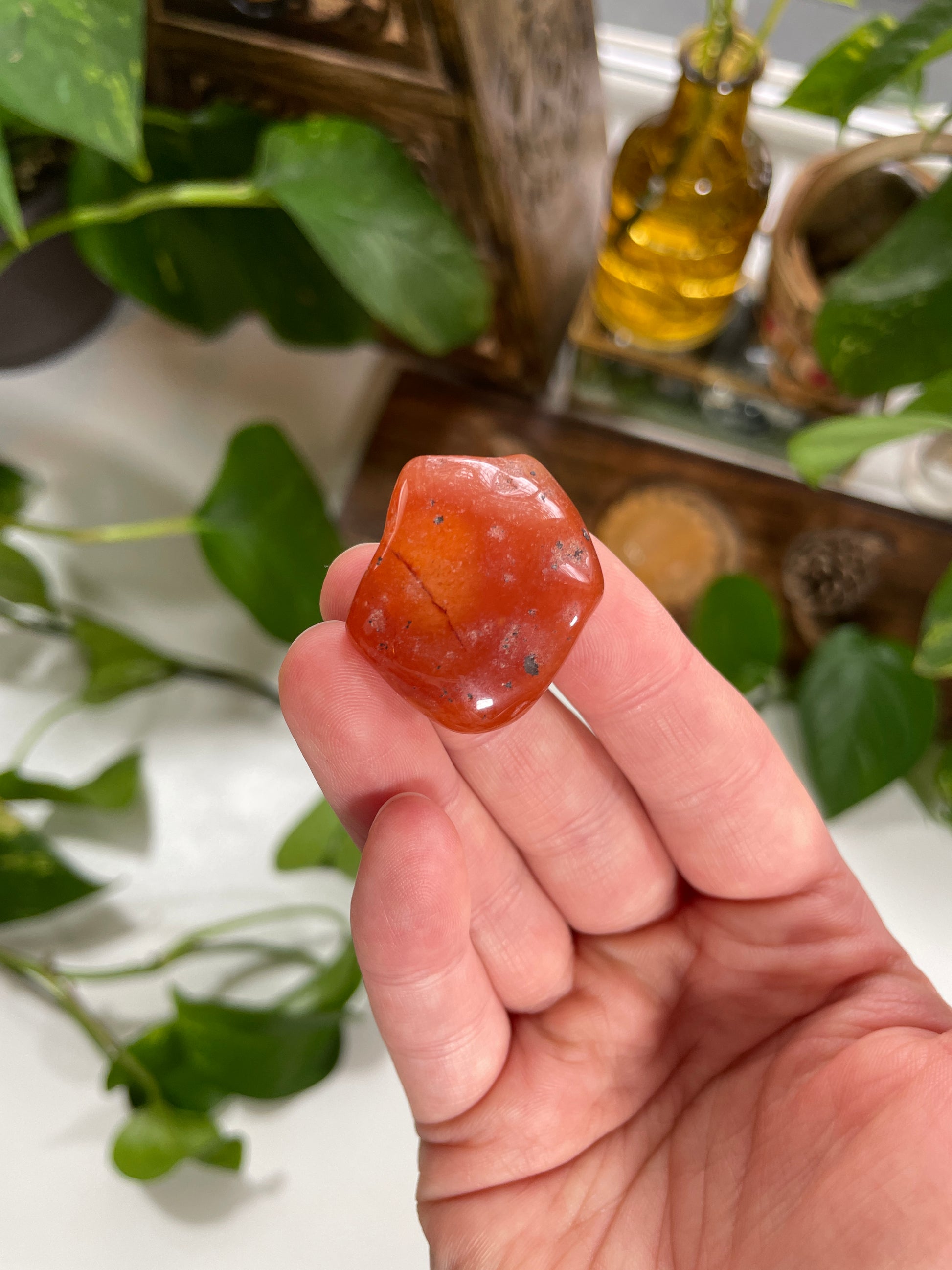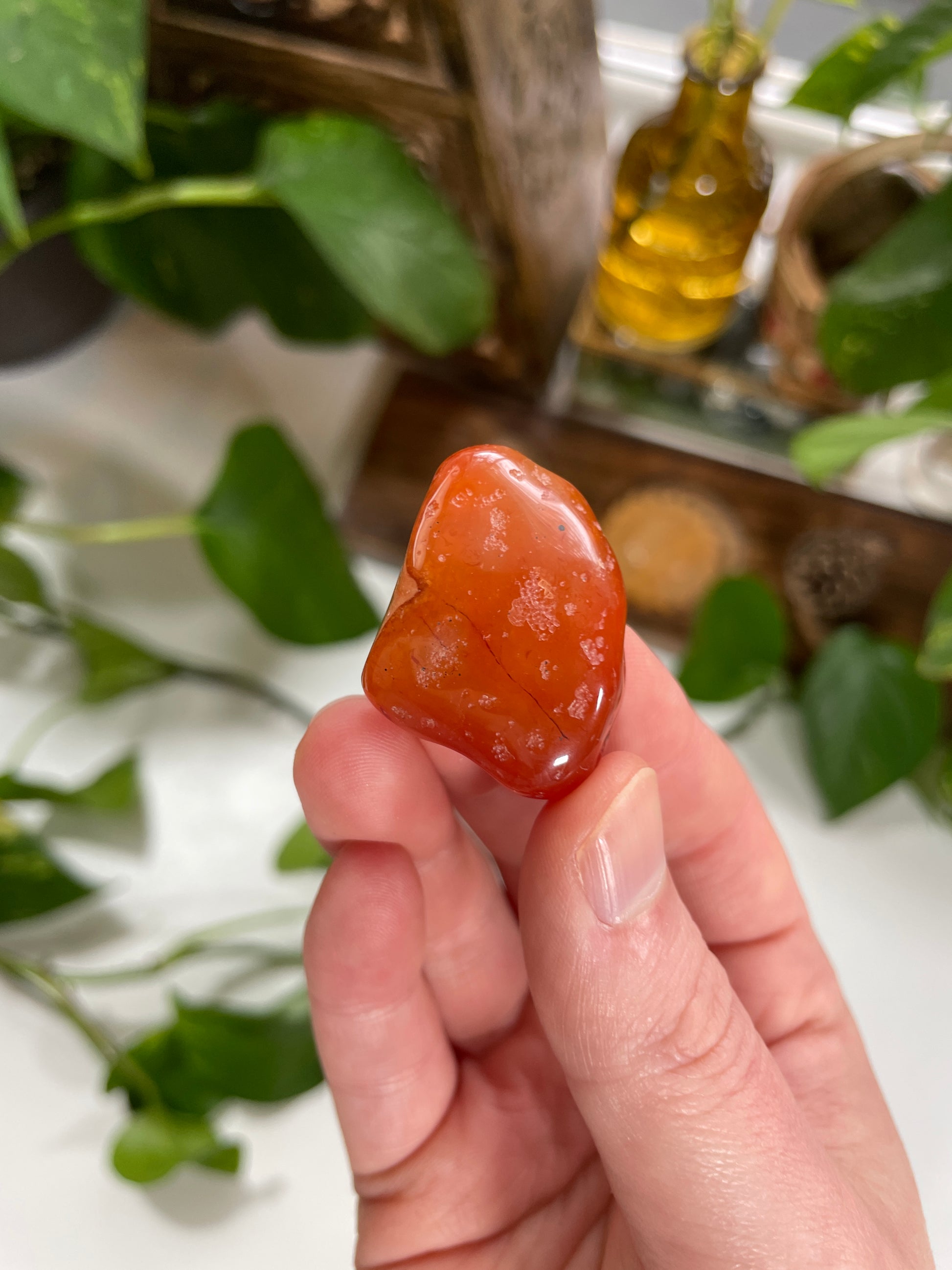 Carnelian is a red/orange colorful quartz of the Chalcedony family. It brings with it a boost of creativity, inspiration and motivation. It's a wonderful stone when you need to get things done or if you're looking for an added confidence boost!