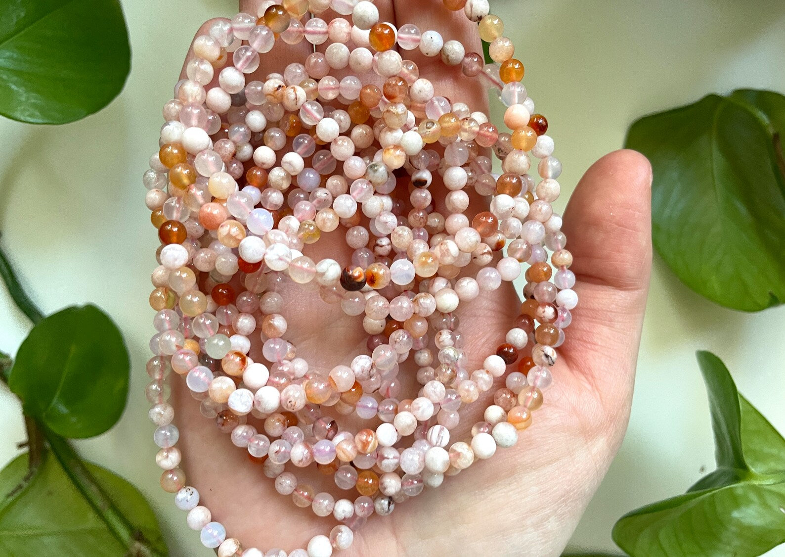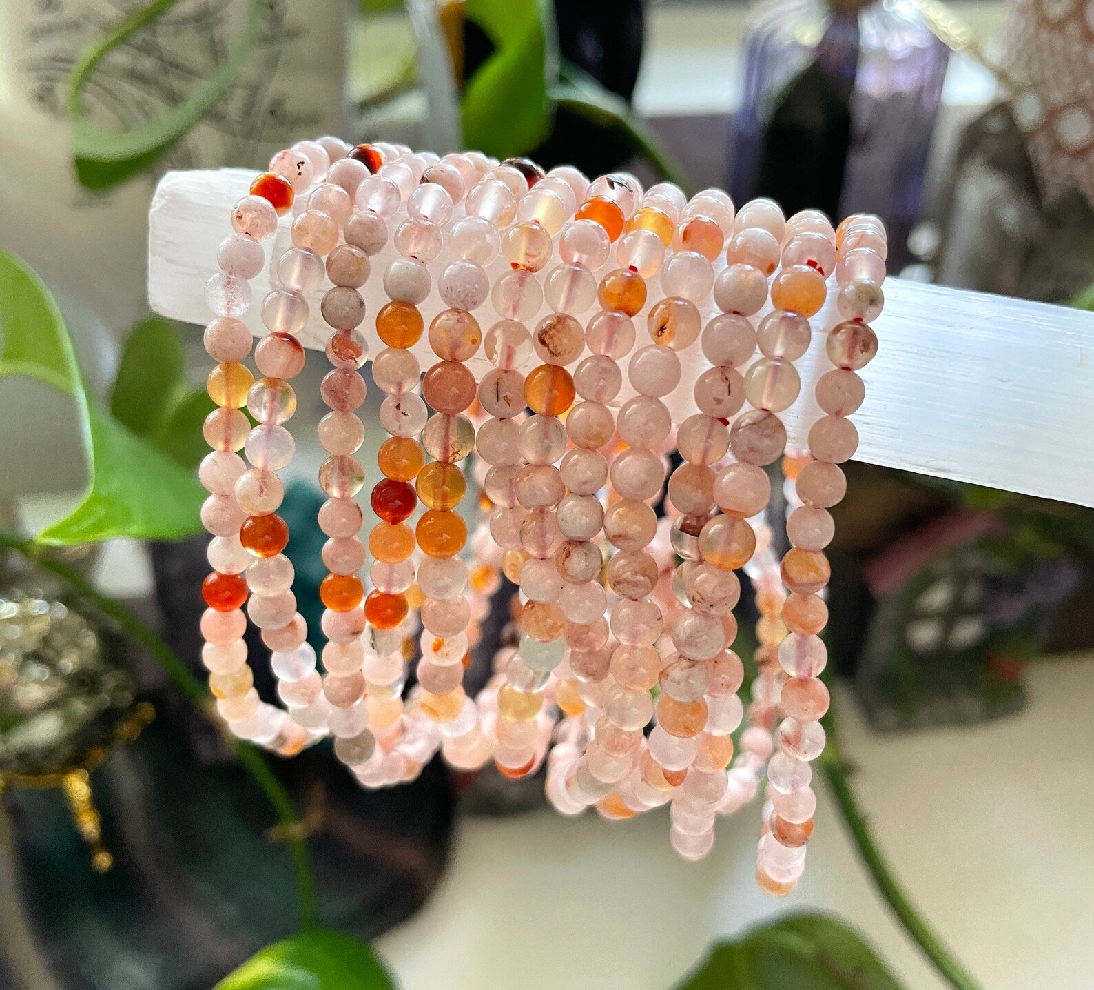 Often used to help with personal growth, Flower Agate is a gentle and nourishing crystal that helps to connect the Root Chakra (security) with the Heart Chakra (unconditional love). The stones in these bracelets are a mix of cream, orange, and light pink and each one is unique.