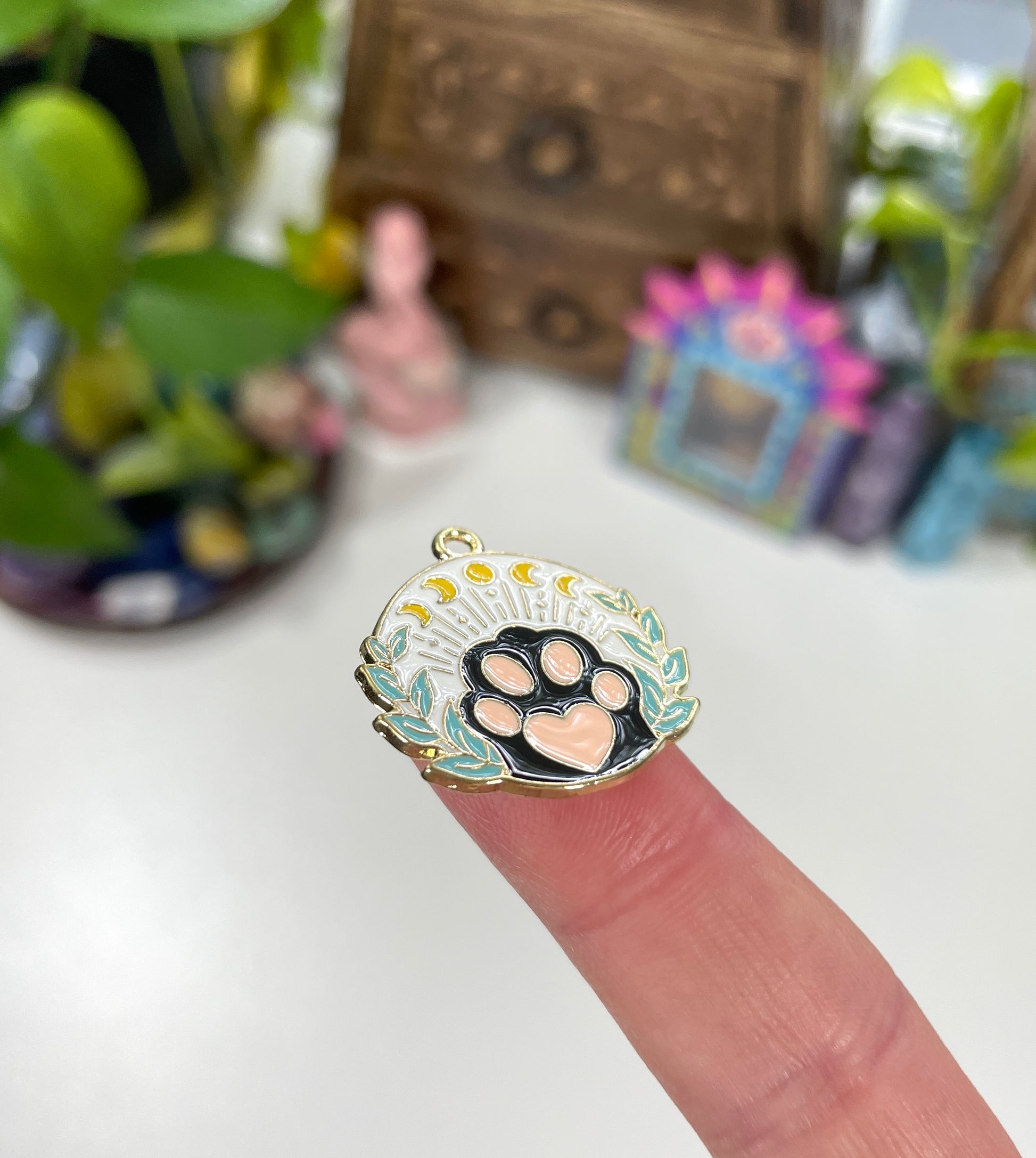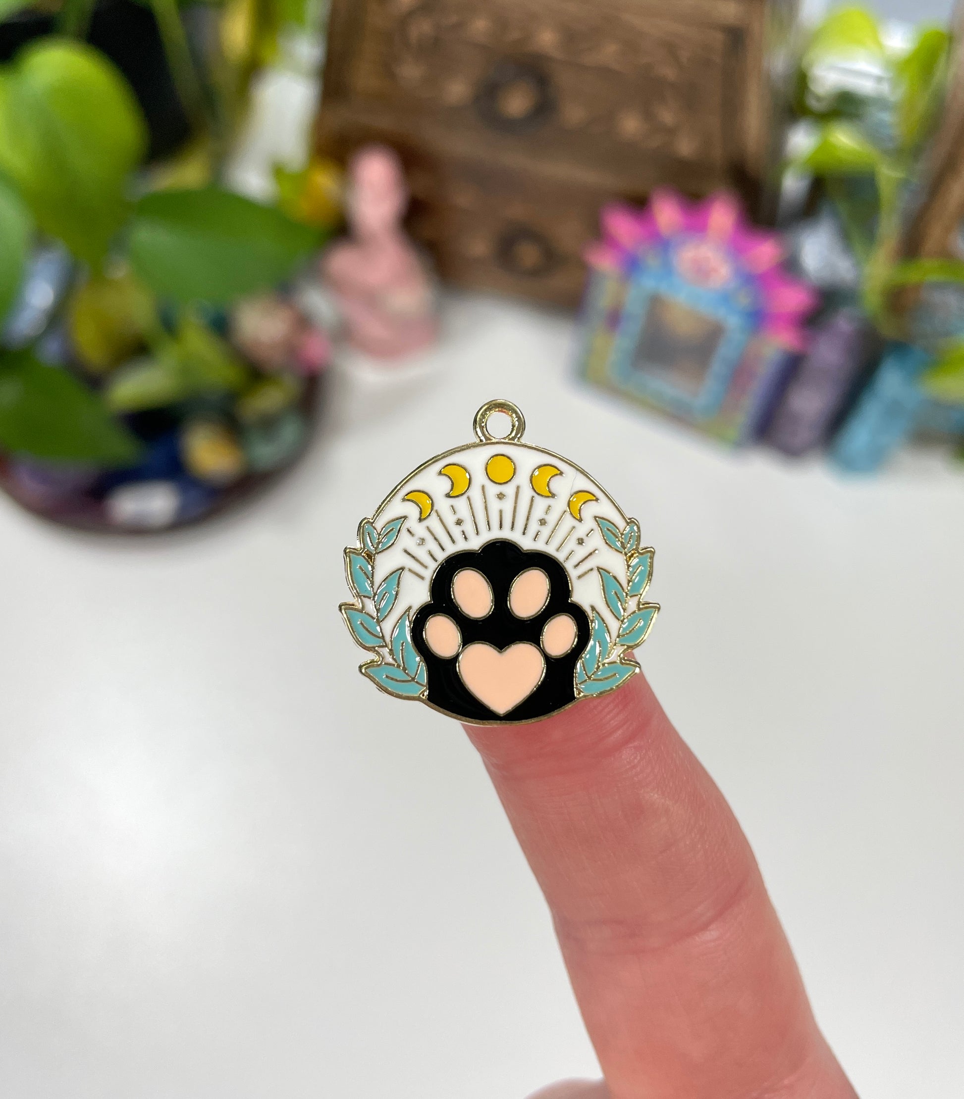 A black enamel paw print with a soft heart at its center, crowned by glowing moon phases and cradled in pale green laurels. This charm honors the sacred bond between soul and animal whether a beloved pet, a spirit familiar, or a guardian who walks beside you.