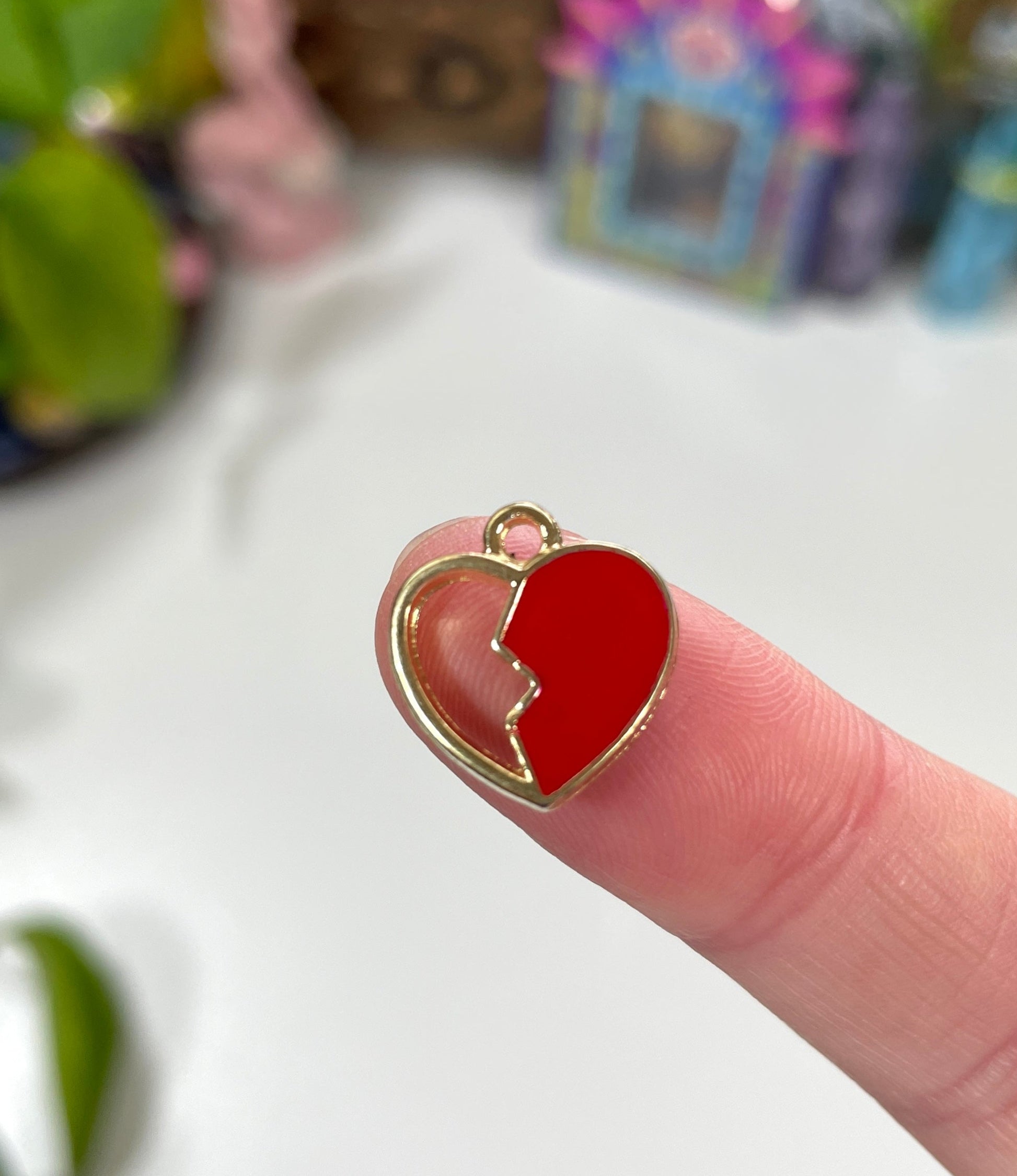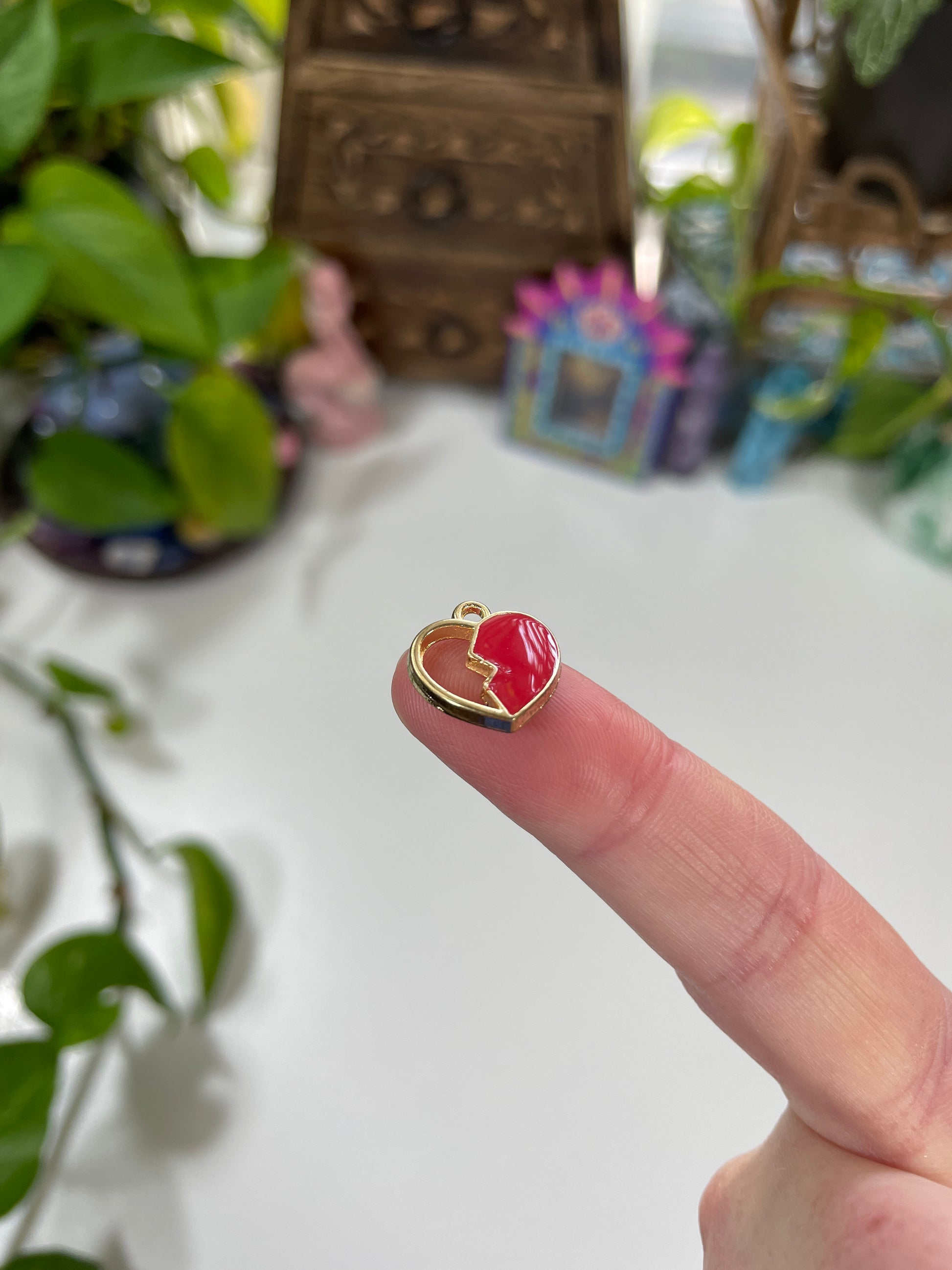 A red enamel broken heart charm representing emotional pain, separation, grief, and vulnerability. Use it in charm casting to explore themes of heartbreak, healing, or letting go of a person, dream, or version of yourself.