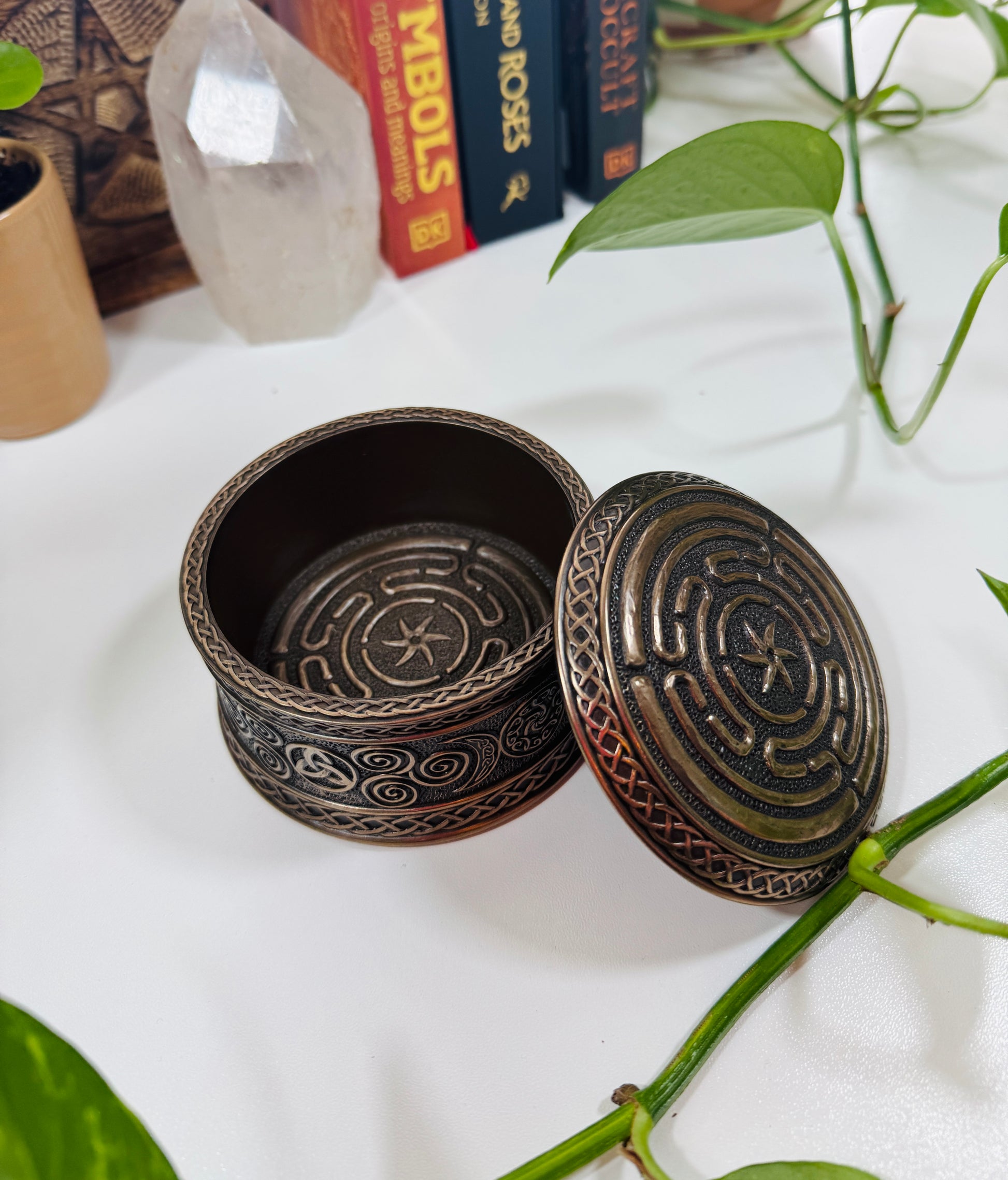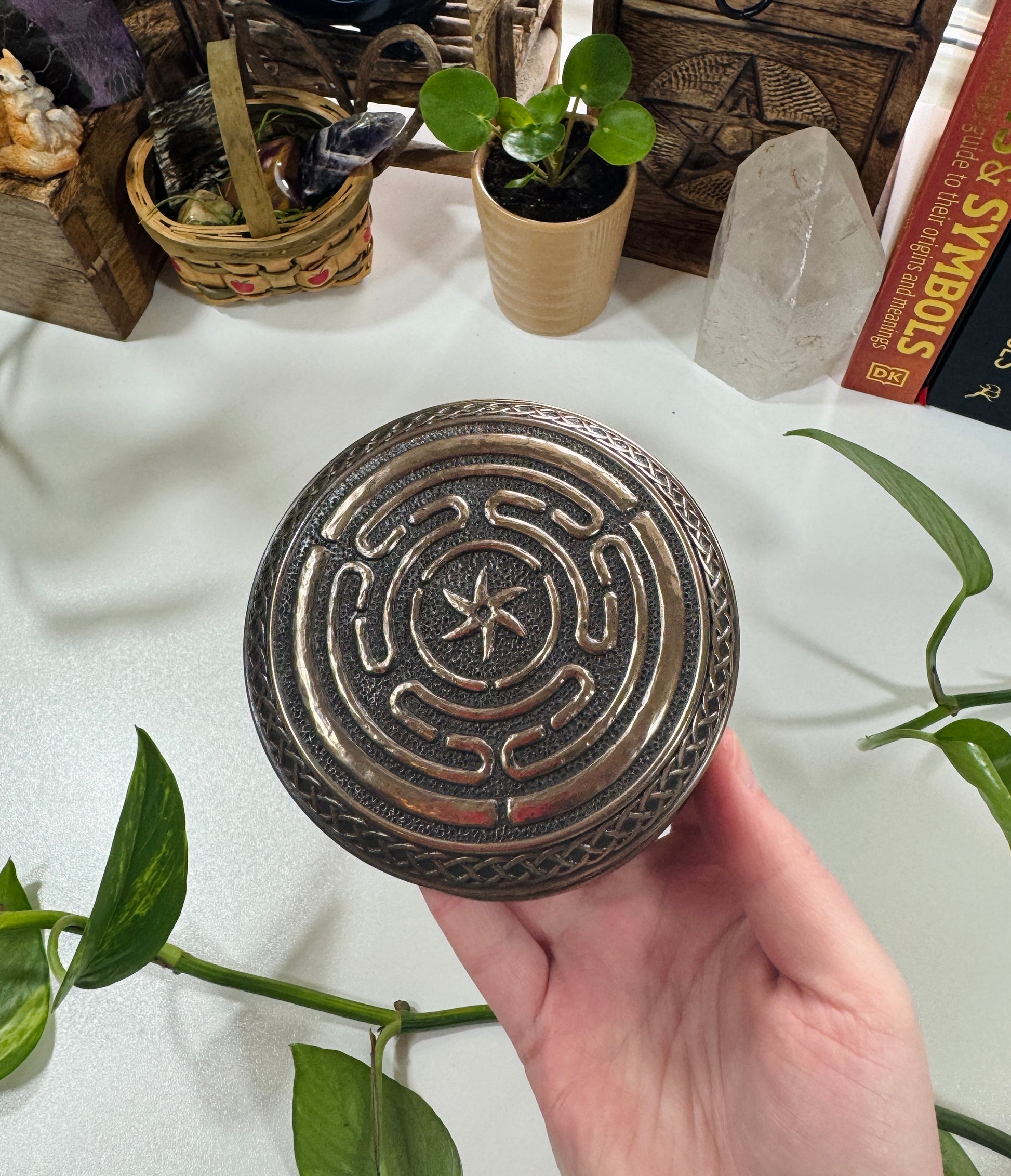 A beautifully detailed trinket box featuring Hecate’s Wheel (Strophalos). An ancient symbol connected to the Greek goddess of magic, crossroads, and liminal spaces. The labyrinth design represents the three aspects of the goddess (maiden, mother, crone), cycles of life, and the soul’s journey through transformation.