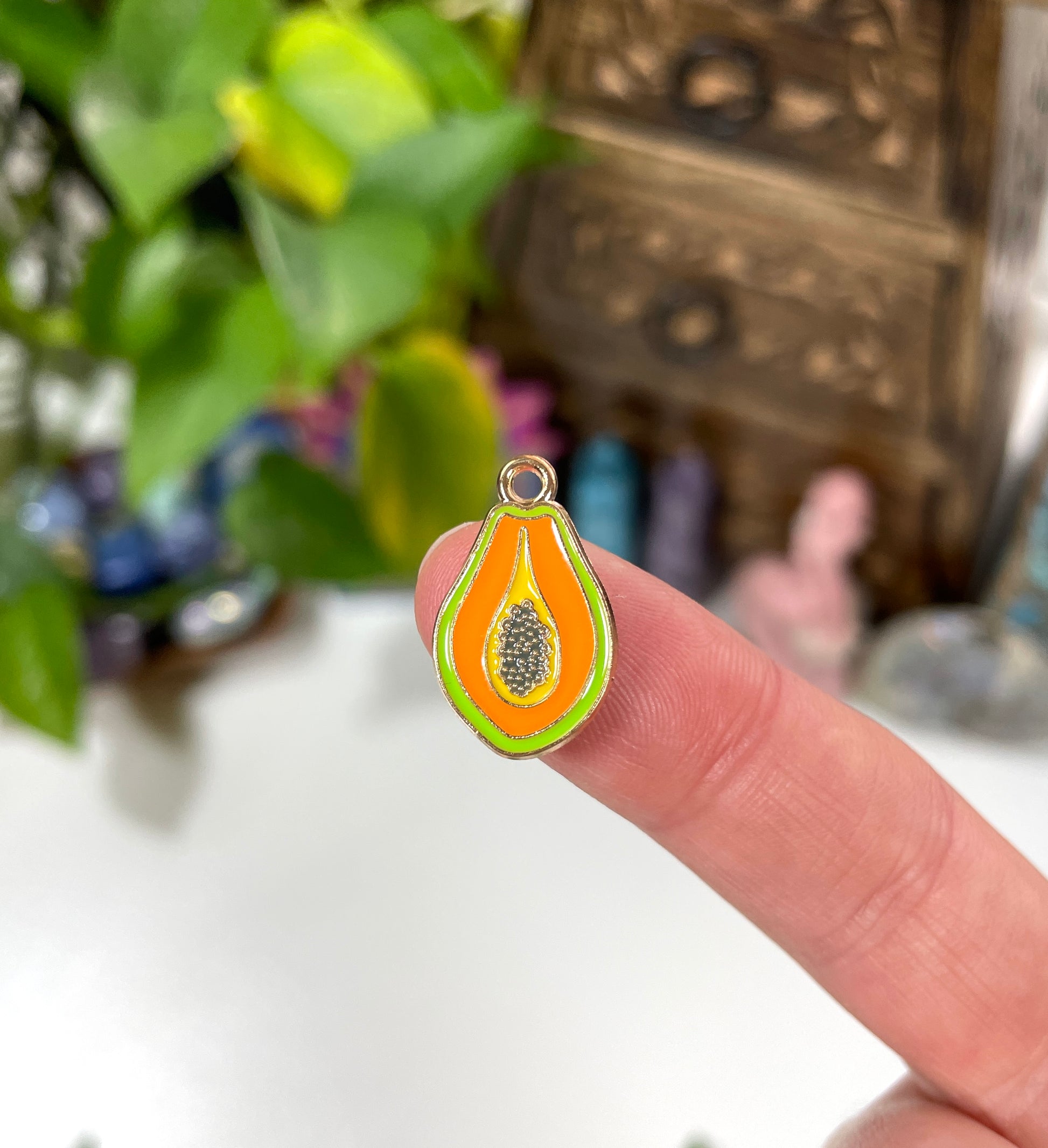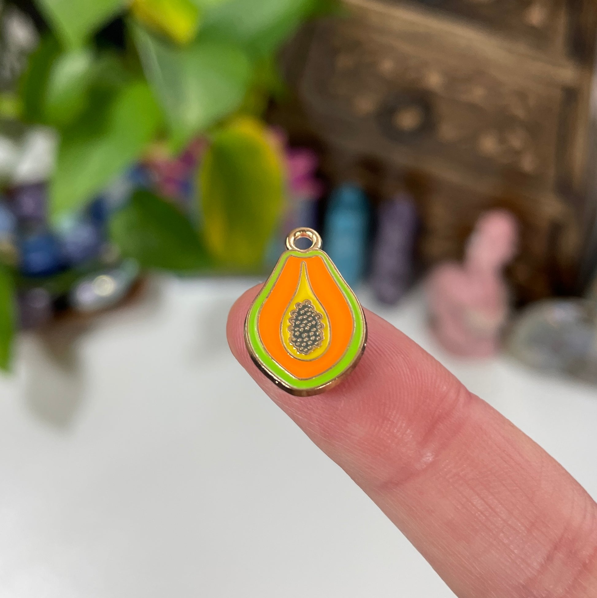 A vibrant enamel papaya bursts with tropical color. This charm radiates abundance, nourishment, and the sweet rewards of self care.