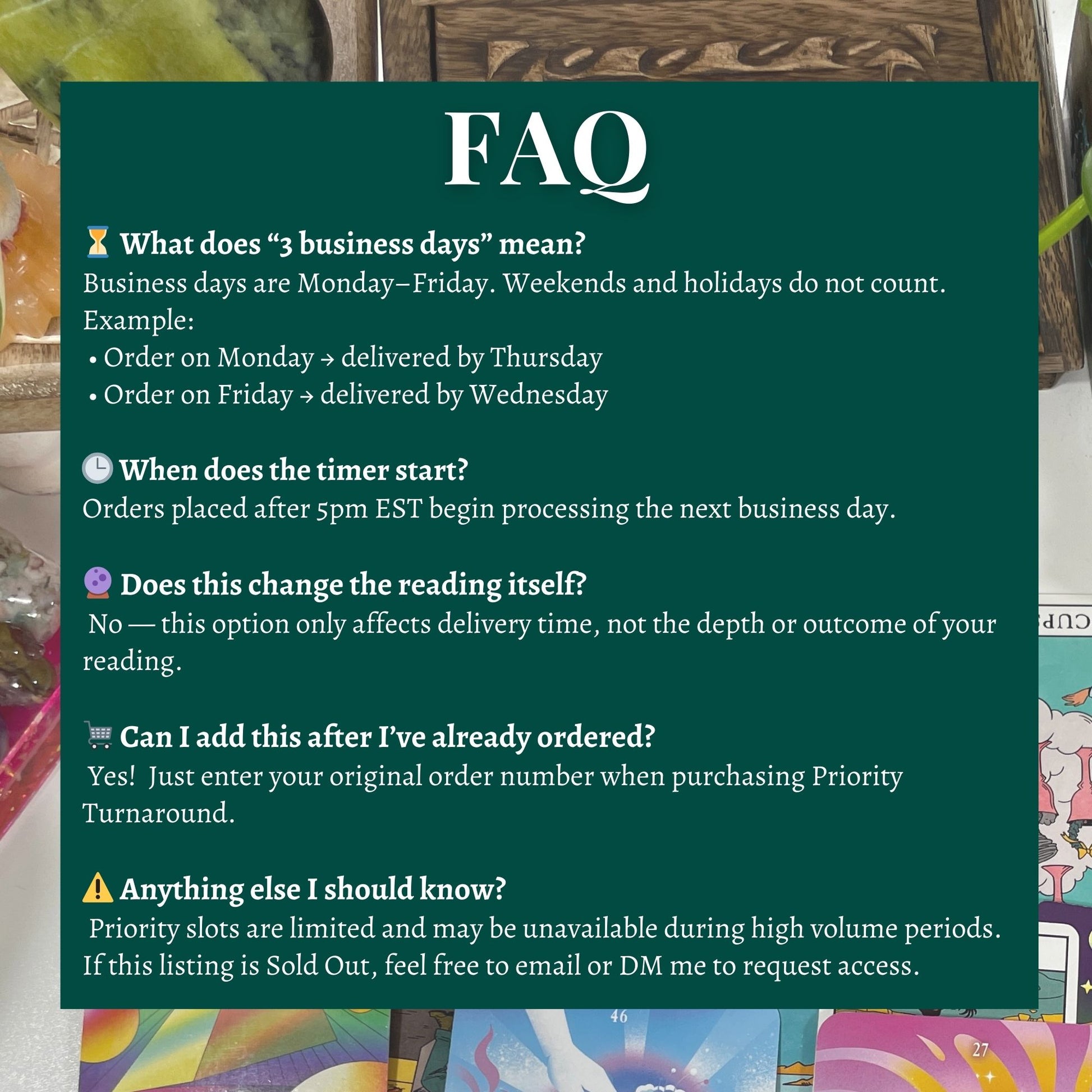 • If you order on Monday with Priority Turnaround, your reading will be delivered by Thursday.