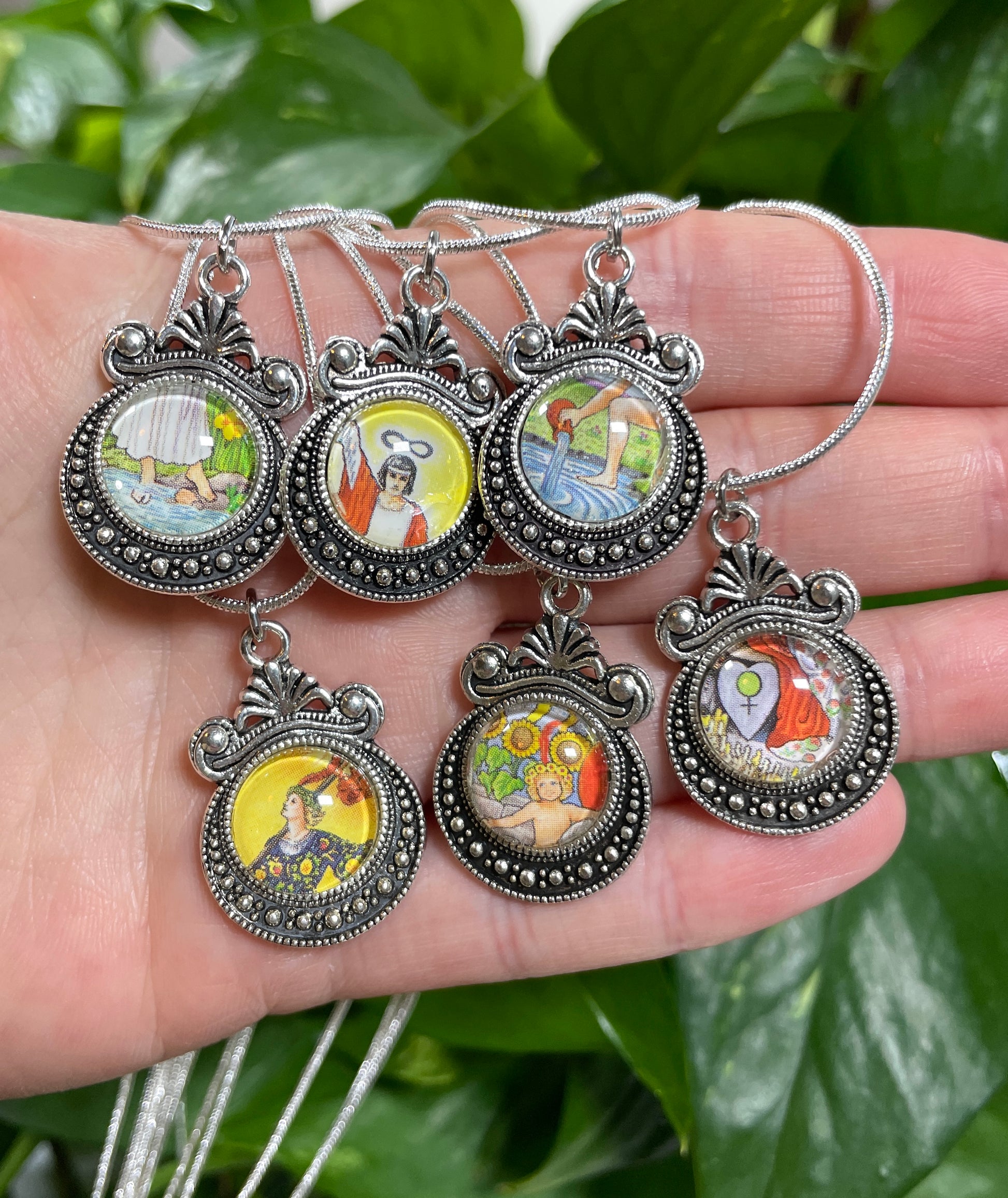 These one-of-a-kind necklaces are lovingly created from carefully selected, miniature fragments of authentic tarot cards, meticulously preserved to capture the essence of their narratives. Each necklace whispers tales of destiny, mystery, and ancient wisdom, delicately encapsulated within its tiny tableau.