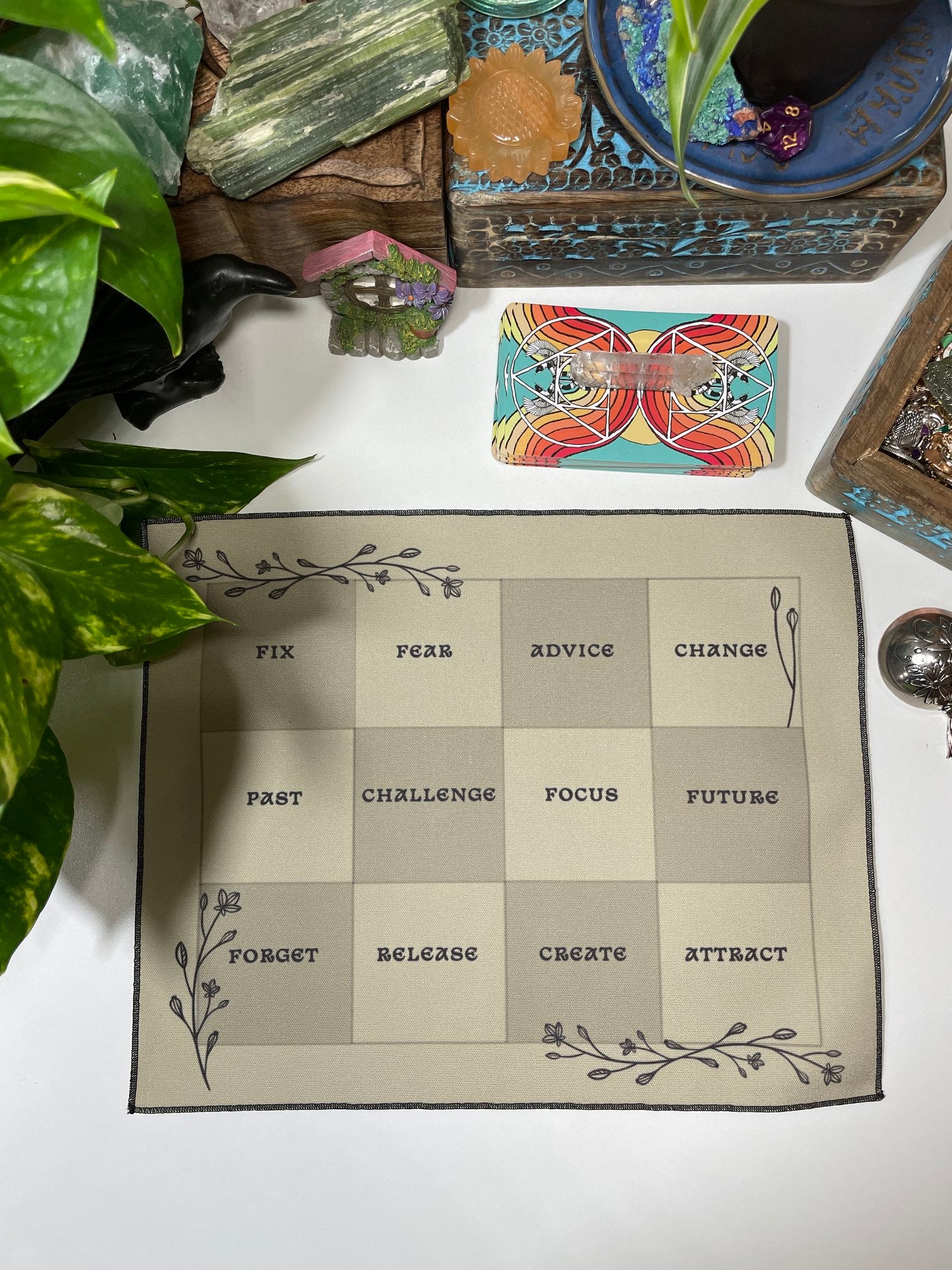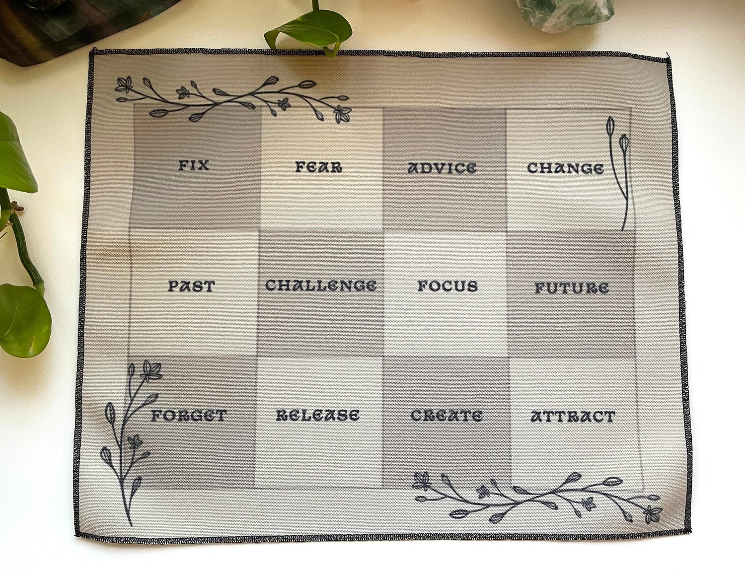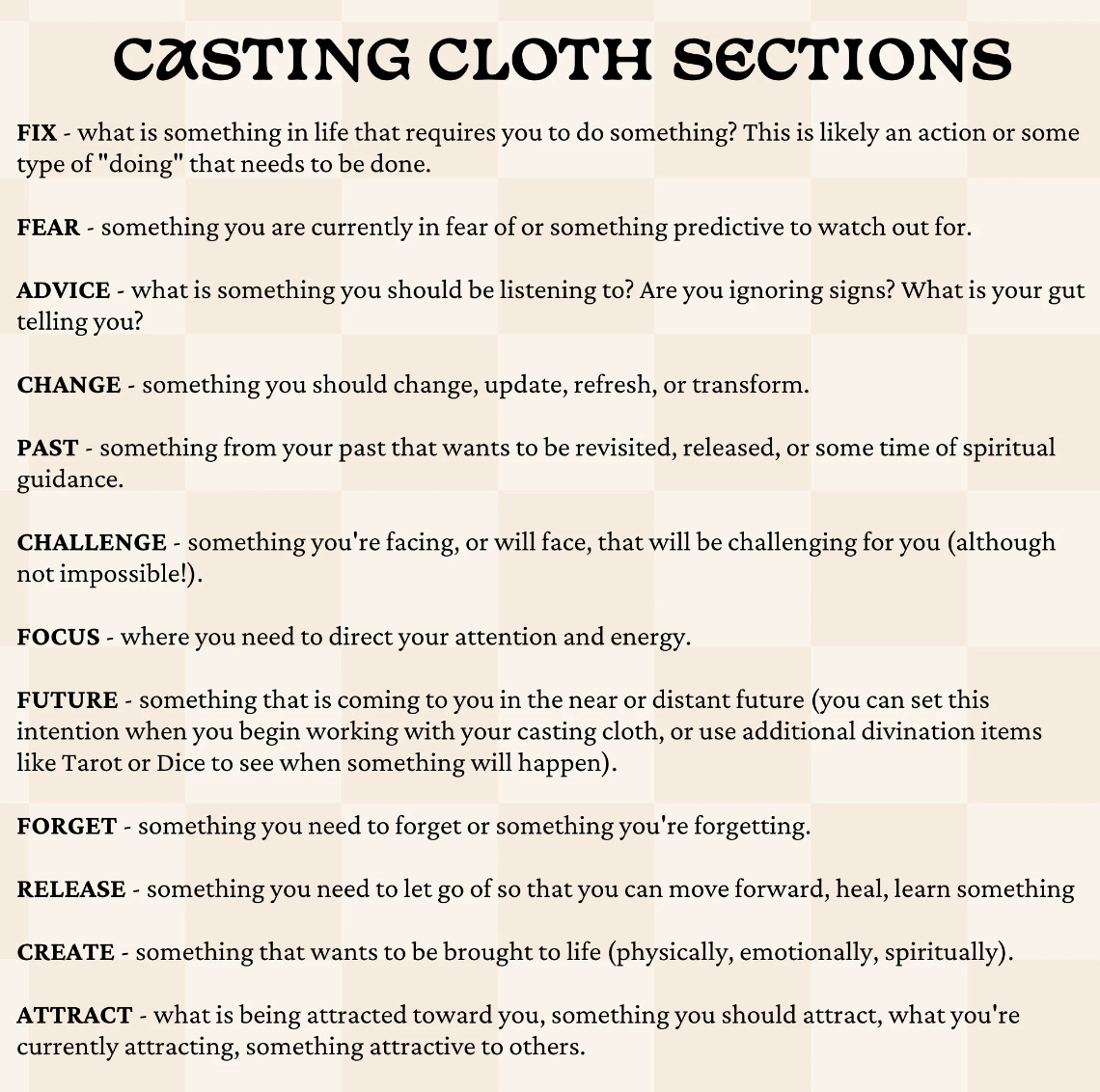 I designed this casting cloth for my own personal charm casting practice & thought I should share it with you as well. I wanted this one to be simple, with only 12 boxes (each box design slightly larger than most casting cloths in my shop). This casting cloth is simple yet actionable for whatever your current circumstances are.