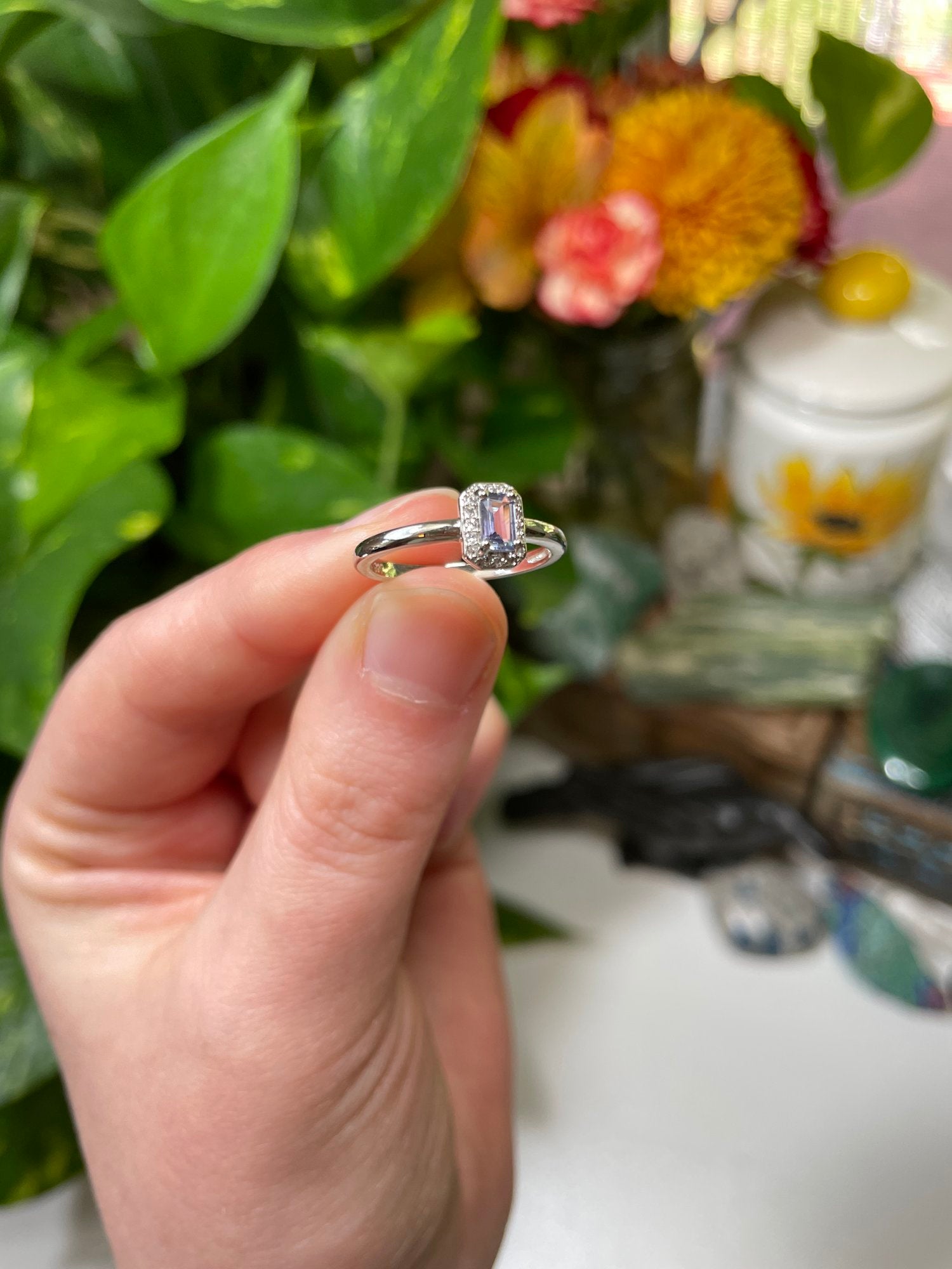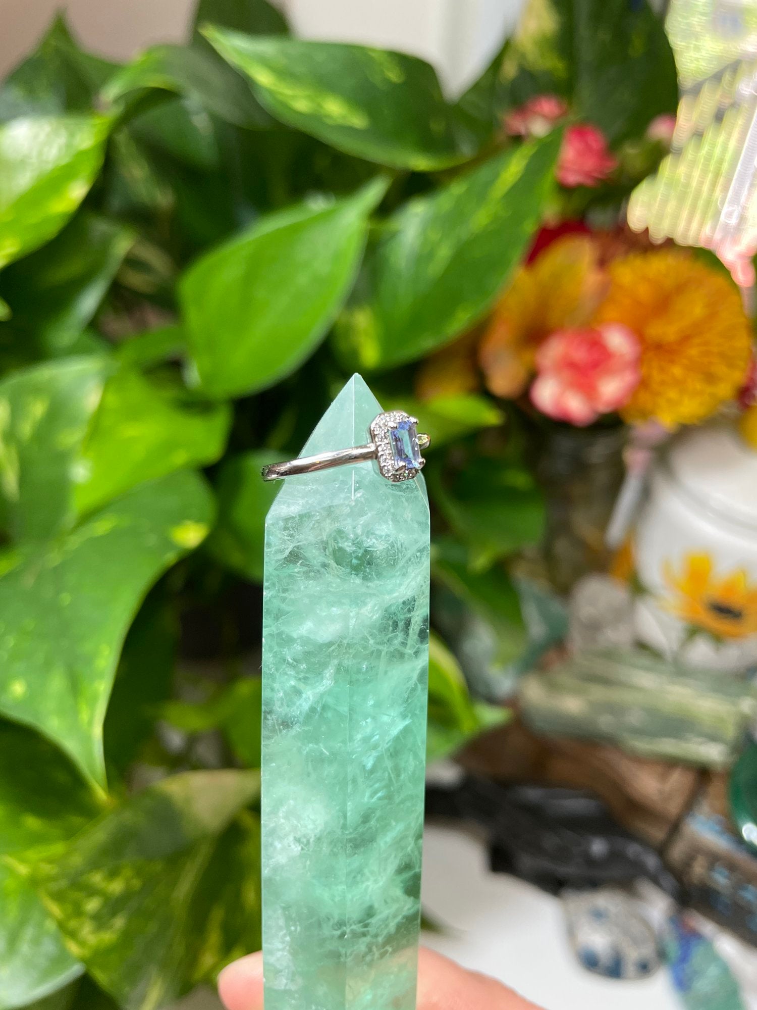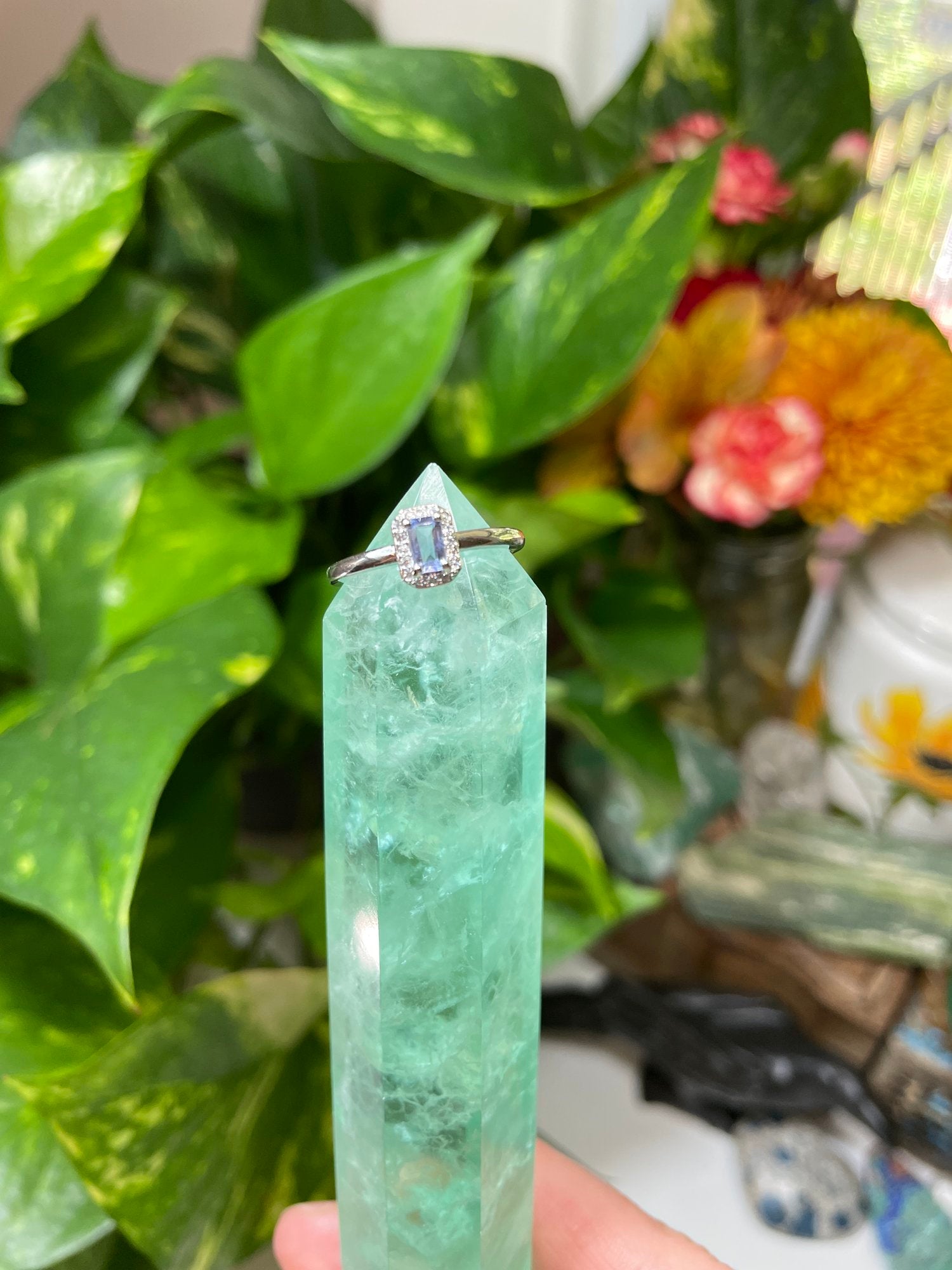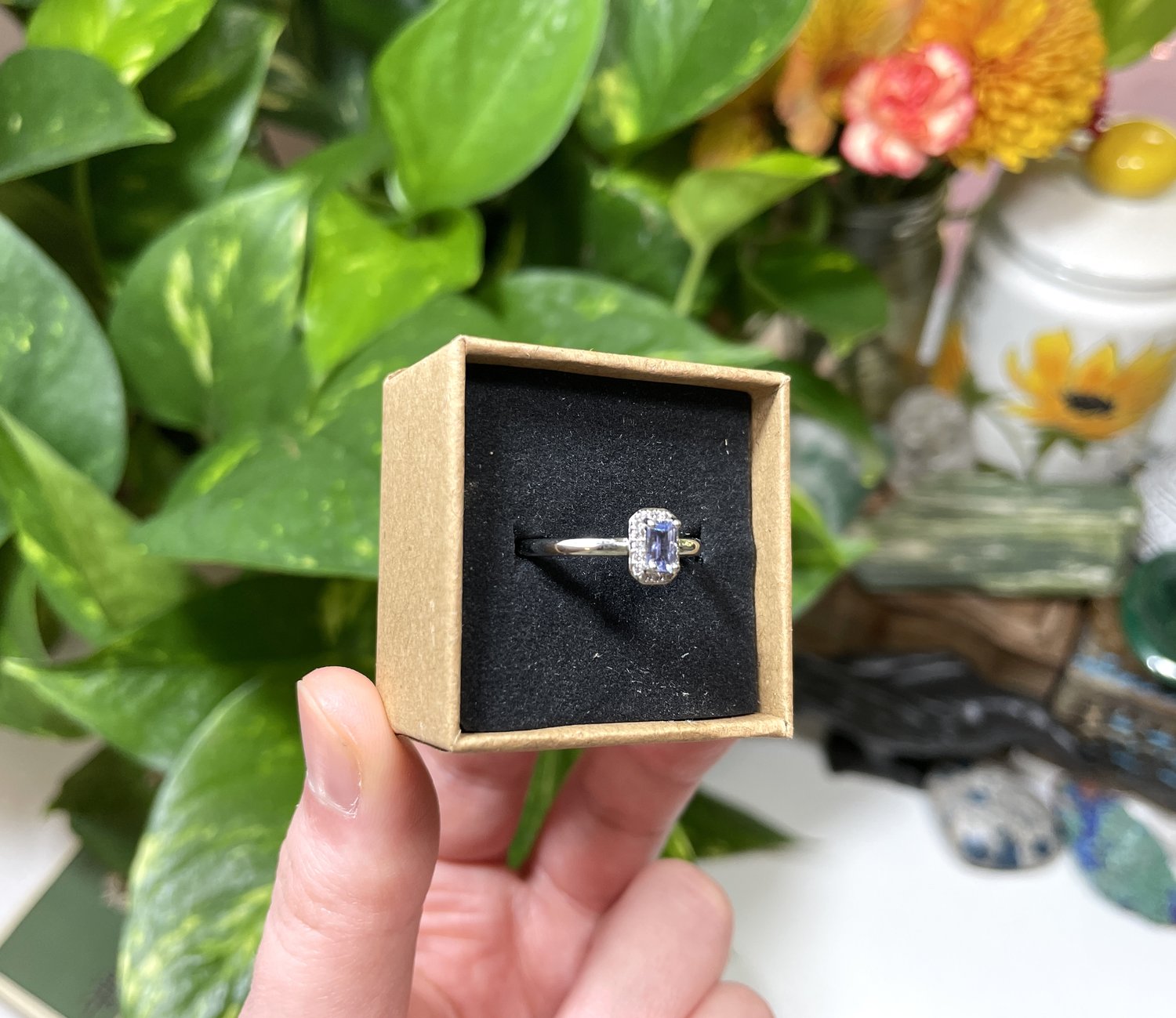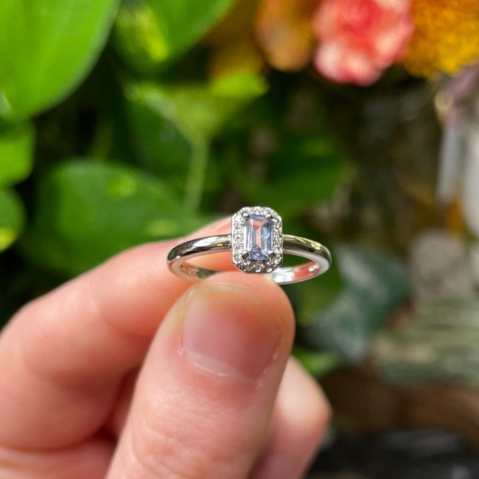 These gorgeous rings contain a Tanzanite stone in a white bronze band and setting.