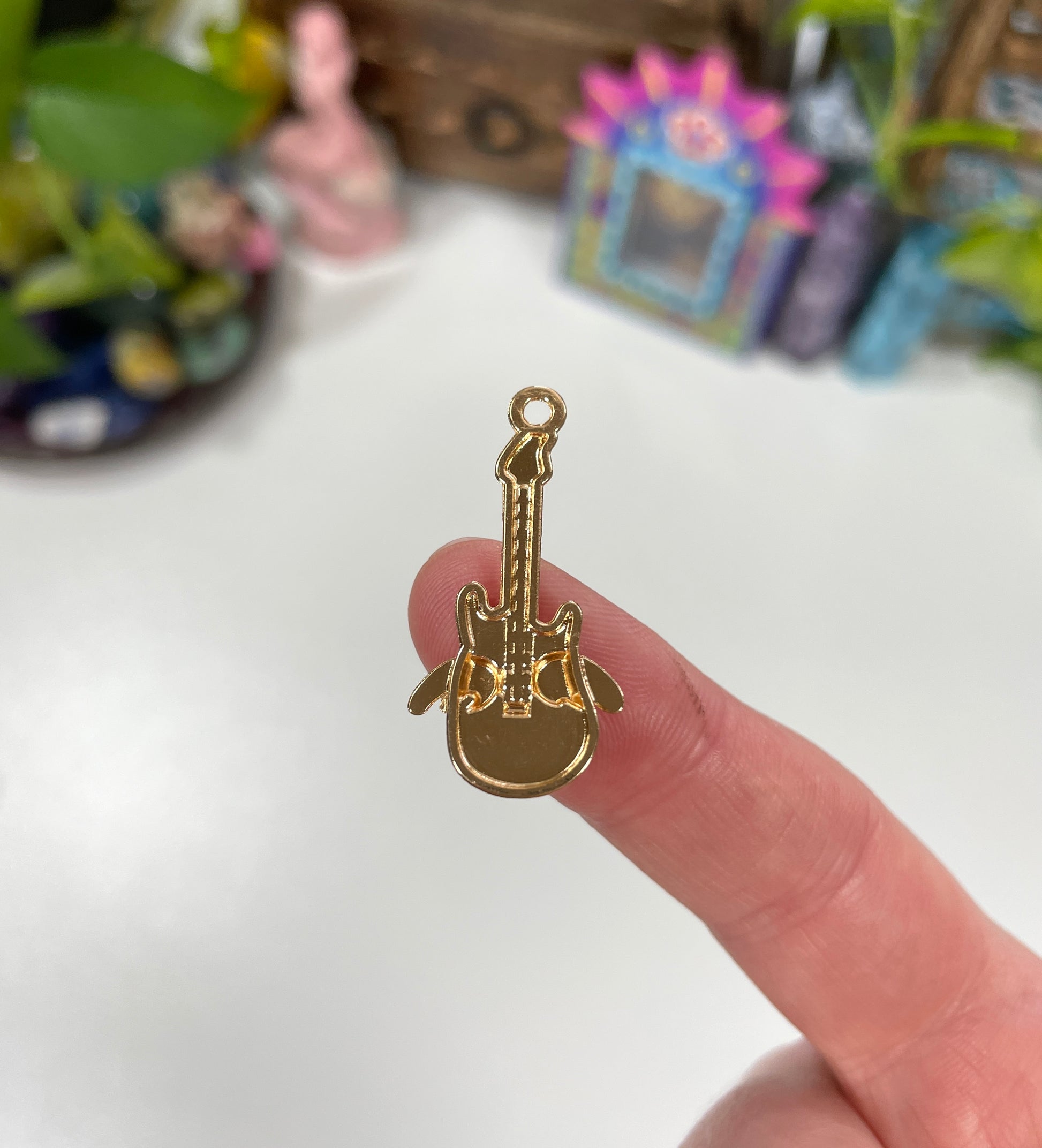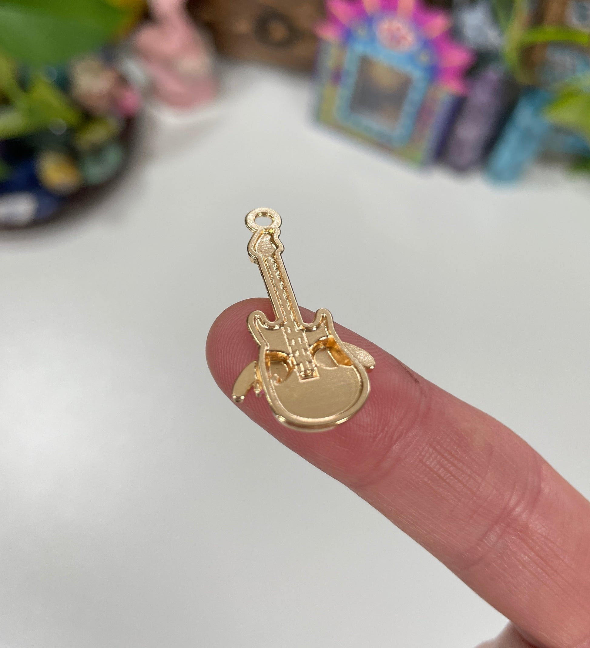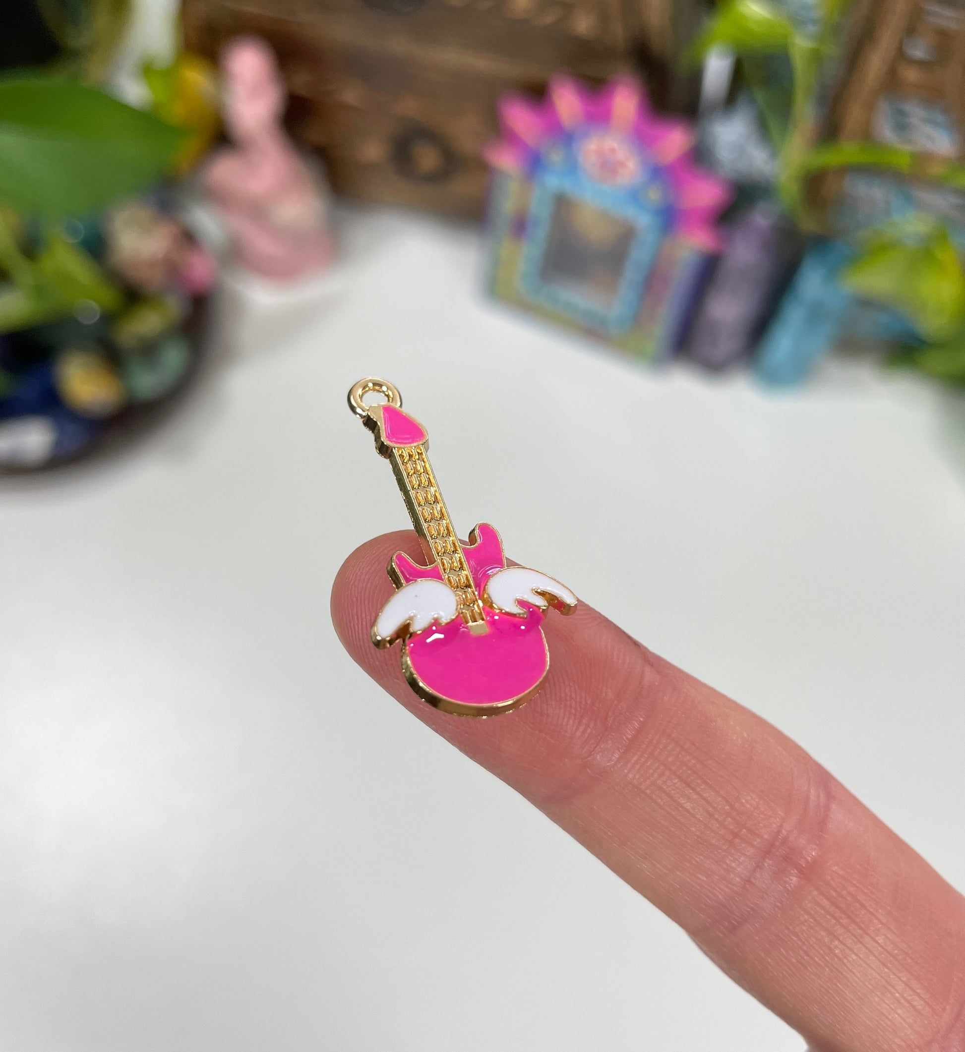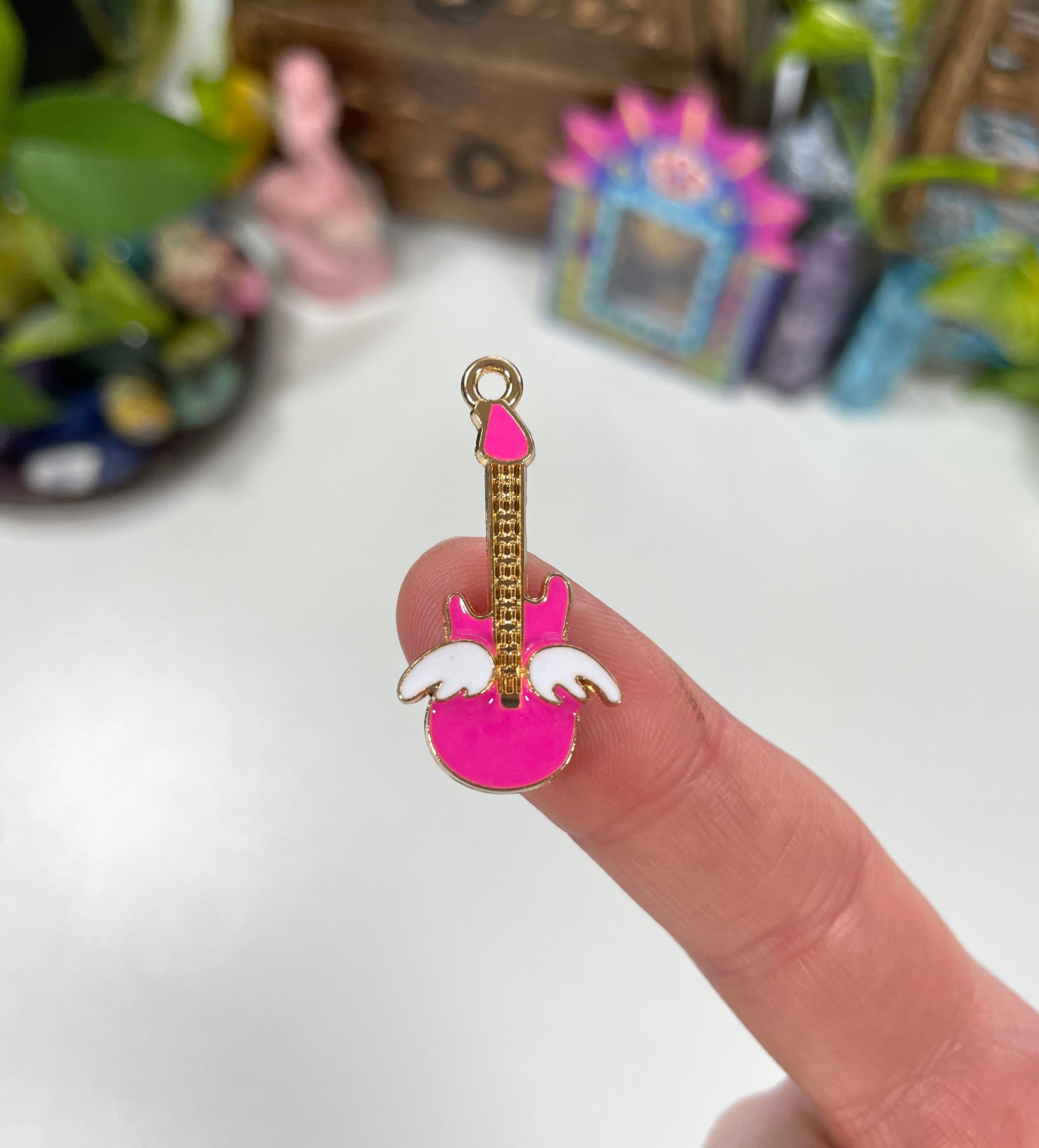 A hot pink enamel guitar with golden strings and white angel wings, symbolizing creative expression, divine inspiration, and the magic of sound. Use it in charm casting for themes of creativity, confidence, music, and spiritual alignment through art.