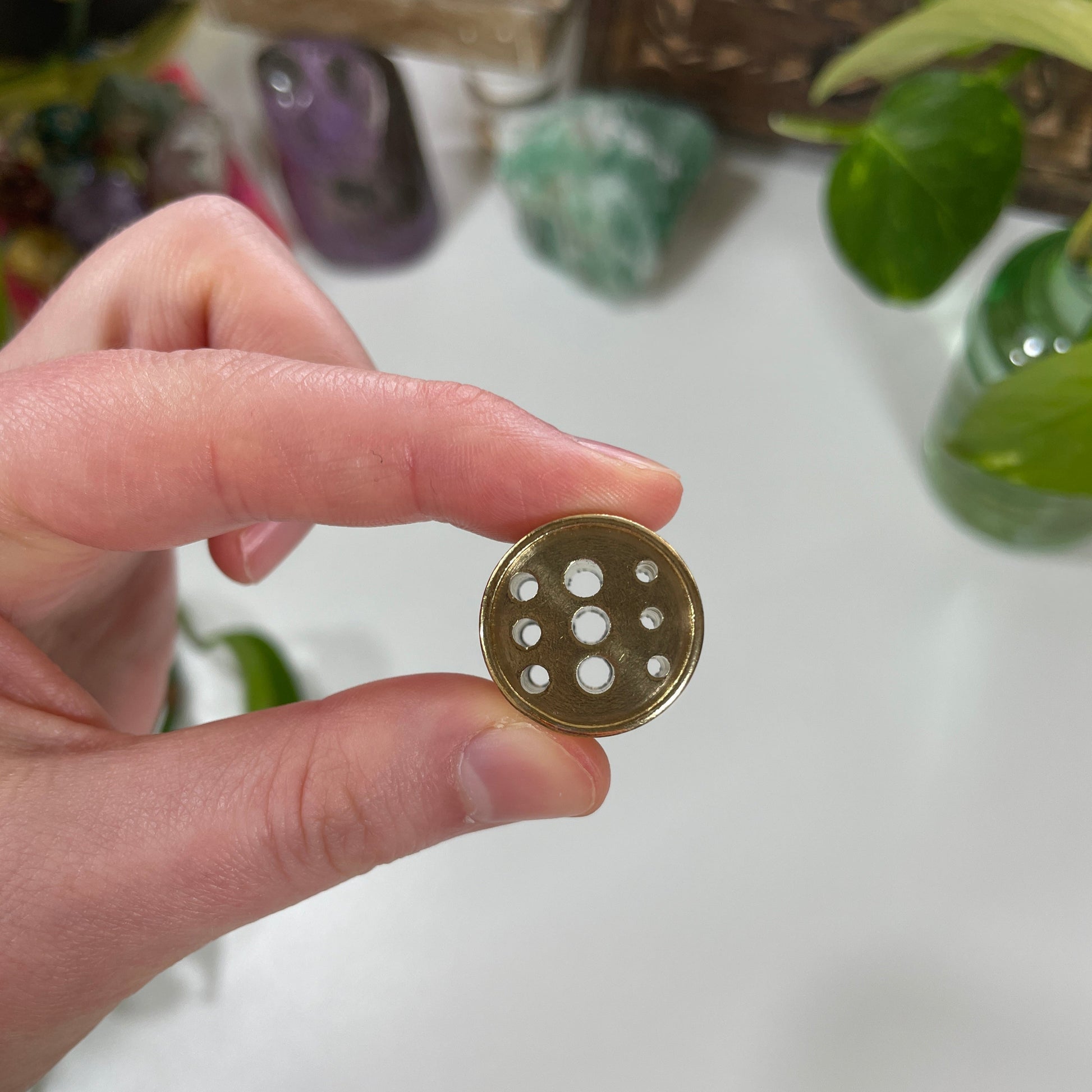 This compact brass burner features 9 small holes, perfect for burning stick incense during your spells, meditations, or cleansing practices. It’s ideal for small altars, travel rituals, or creating moments of calm at your desk or bedside.